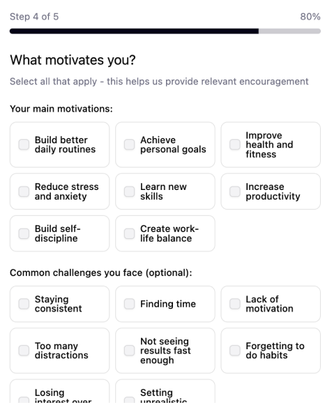 You choose how experienced you are with habits, how much time you can dedicate daily, and what part of the day feels natural for emotional work — morning clarity, afternoon recalibration, evening reflection, or a flexible flow.