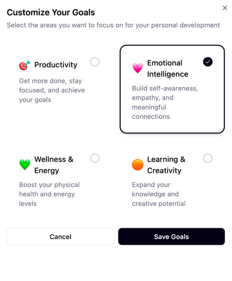 The next onboarding block helps you define what truly matters right now. You select the emotional and career-relevant skills you want to strengthen — such as emotional balance, empathy, communication, leadership presence, resilience, conflict navigation, or clarity under pressure.